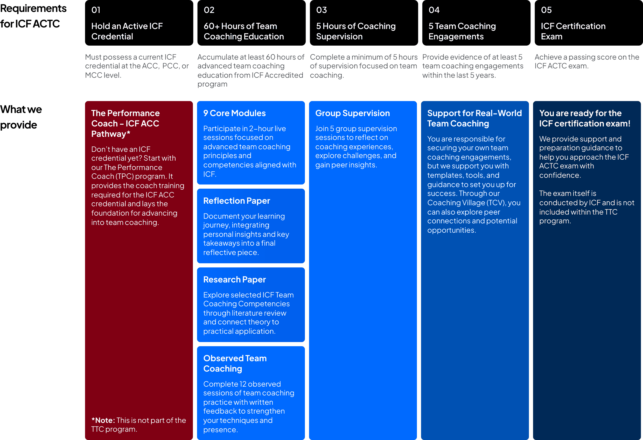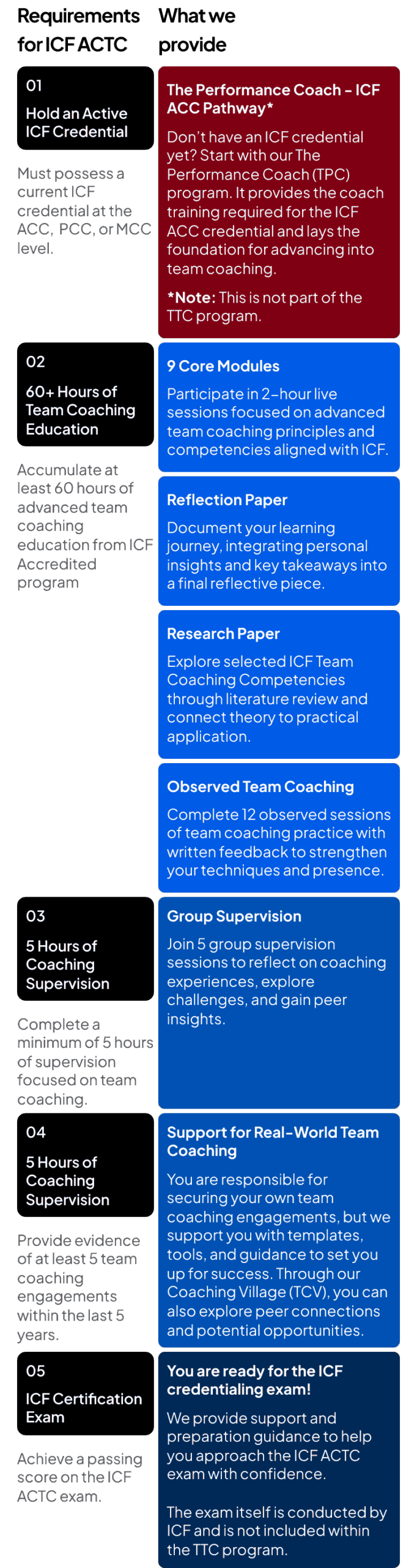 If you already hold an ICF credential (ACC, PCC, or MCC), earning your ICF Advanced Certification in Team Coaching (ACTC) requires four key steps – and our TTC program helps you complete two of them!